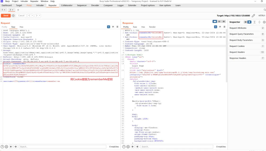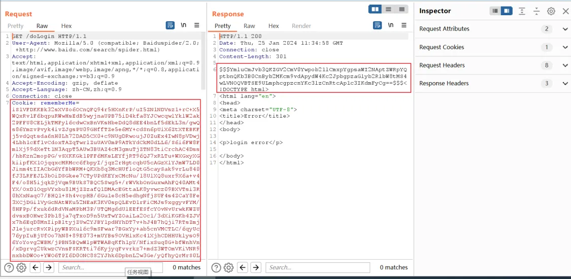 在HTTP请求头Cookie里rememberMe字段,响应体不存在deleteMe。会存在一段base64加密的字段,解码后就是攻击者的回显内容。状态码为200