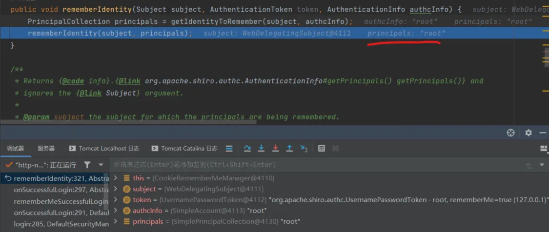 F7 步入 rememberIdentity() 方法,这里继续调用getIdentityToRemember(),作用就是获取用户名赋值给 principals