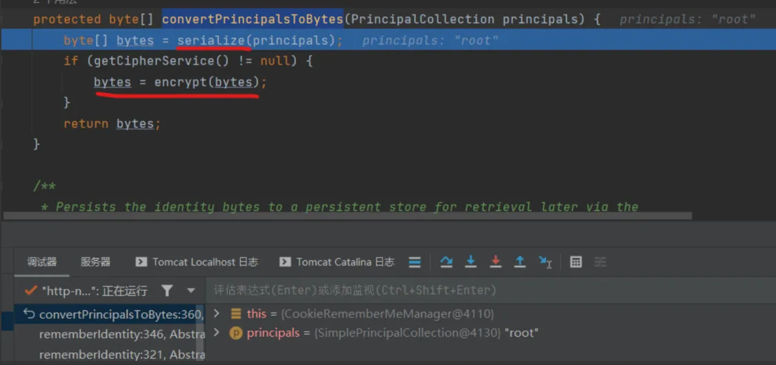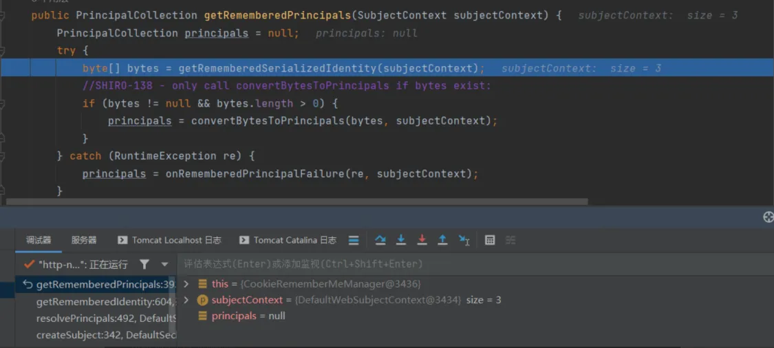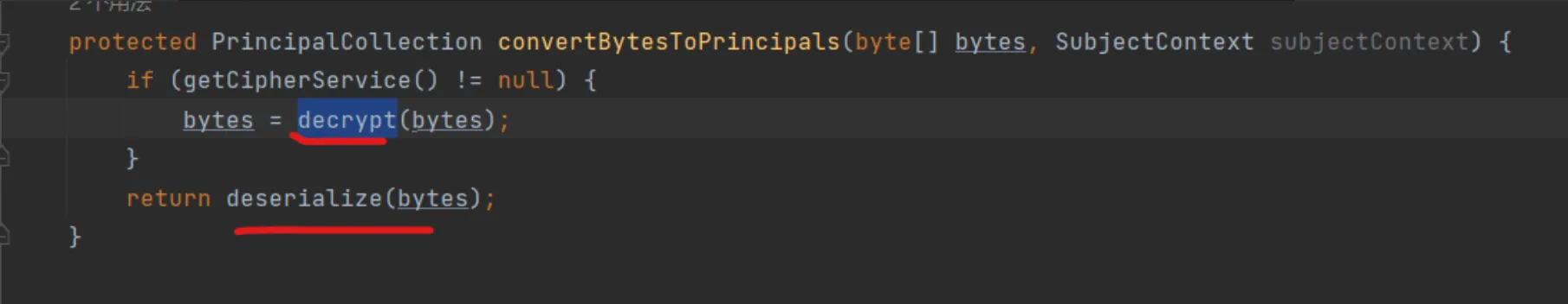 然后回到getRememberedPrincipals()方法,bytes不为null,因此调用 convertBytesToPrincipals()方法