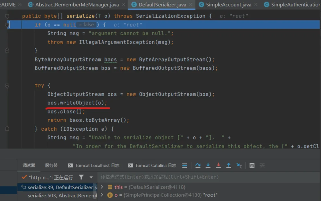 跟进 deserialize()方法 这里会调用 getSerializer().deserialize() 对我们 base64解密-AES解密后的rememberMe的值进行反序列化