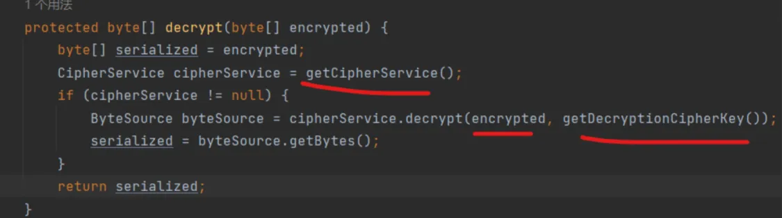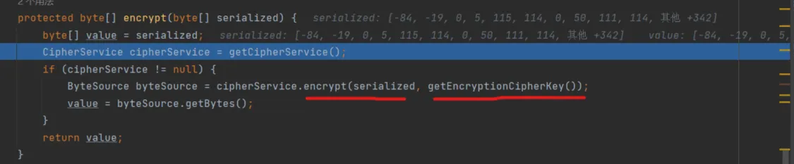 它先对用户名进行序列化处理,然后调用this.getCipherService()方法是否有返回值,存在的话,就调用 encrypt() 方法进行加密