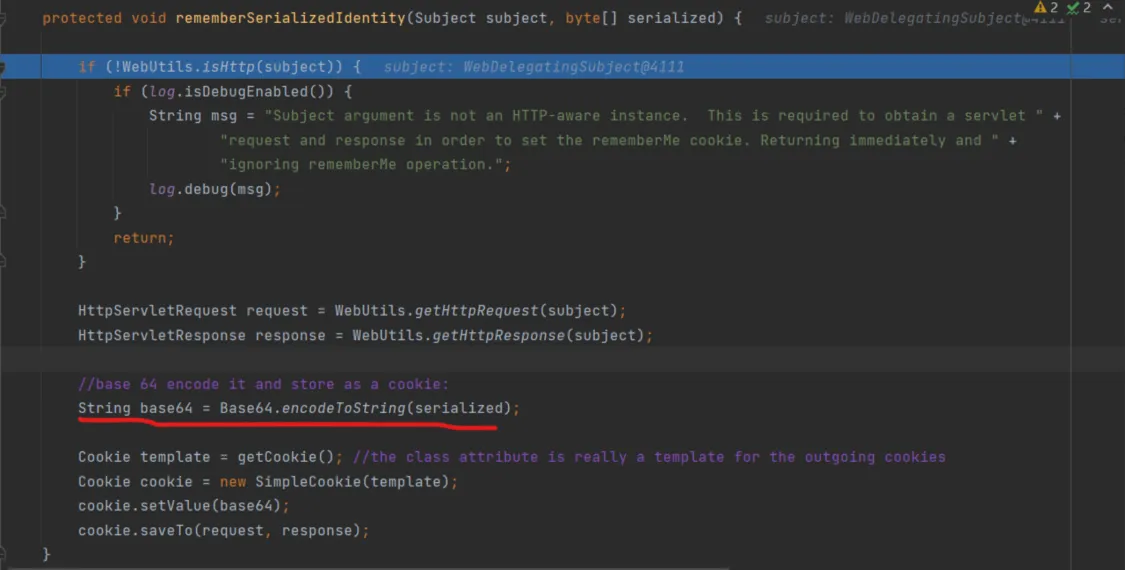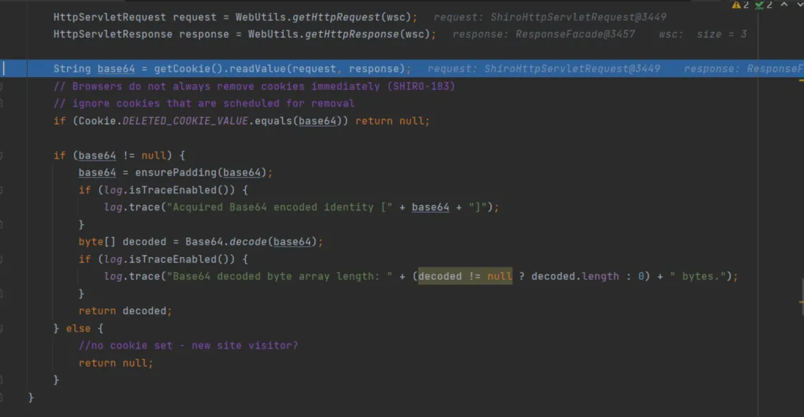 主要功能为:获取cookie中的rememberMe字段,判断值是否和DELETED_COOKIE_VALUE一致 即 deleteme不一致的话,则会再次判断是否是符合base64的编码长度,然后再对其进行base64解码,将解码结果返回赋值给bytes