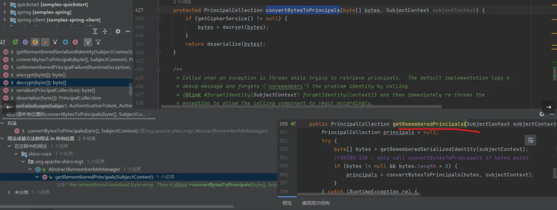 由于我们并不知道哪个方法里面去实现这么一个功能。但是我们前面分析加密的时候,调用了AbstractRememberMeManager.encrypt()进行加密,该类中也有对应的decrypt。那么在这里就可以用来查看该方法具体会在哪里被调用到,就可以追溯到上层去,然后进行下断点
