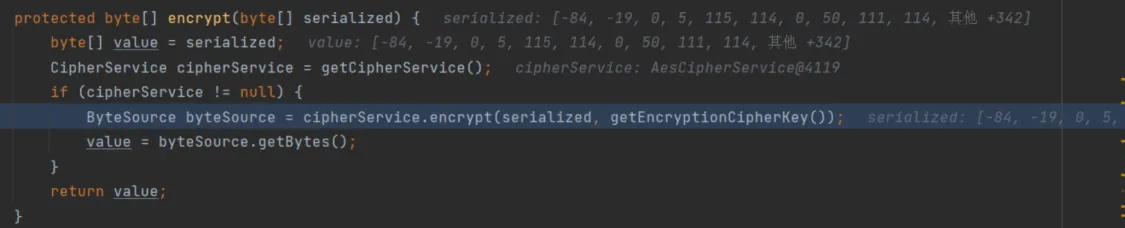 后续加密,会对序列化字节流和密钥常量传入 cipherService.encrypt 进行AES加密