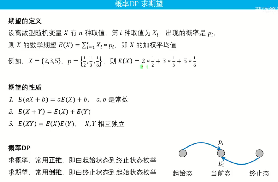 - 考虑本题是求解期望,其实末尾状态时较好得出的,也就是我们经典的倒推,也就是从结尾状态得出初始状态。\(dp[i]\)就为当前结点i转为最终状态结点的期望。因为\(dp[n]=0\),也就是最终状态期望为0,很好想到就是n到n点,路径为0,1*0=0。