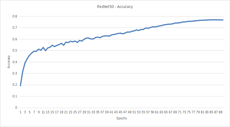 如下图所示,经过90个epoch的训练, 最终精度收敛到了76.76%