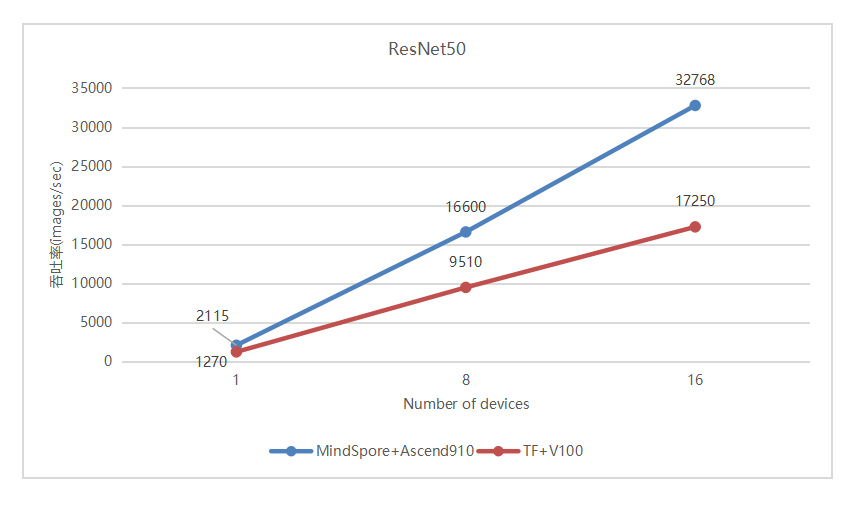 我们分别测试了MindSpore+Ascend910以及TensorFlow+GPU V100在集群下的性能表现,结果如下: