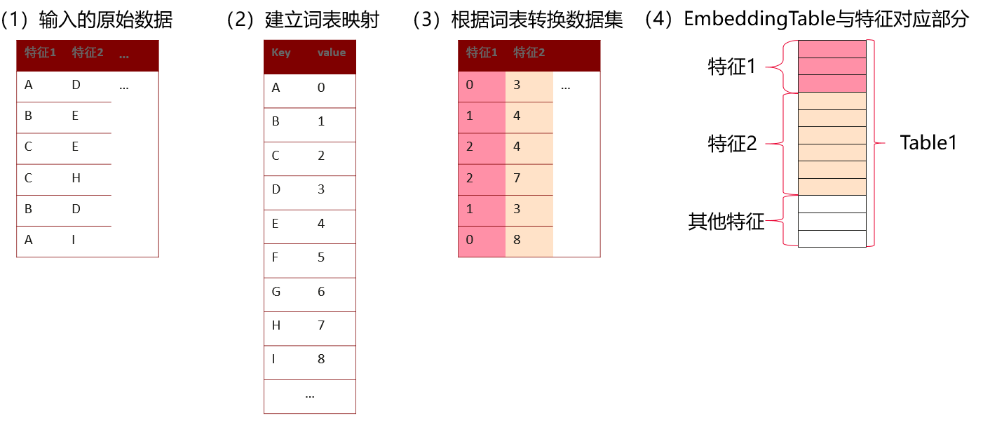 数据处理的核心思路如下图所示,针对类别特征,建立一个词表,里面记录着每次出现的特征取值的编号。 然后再遍历每一列的特征取值,将原始的特征值根据词表映射为对应的id。