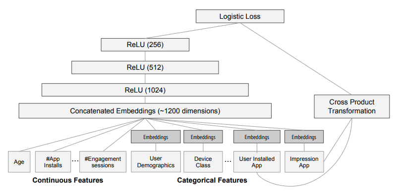 在下图中, Deep模型输入都是一些含义不是非常明显的特征 ,例如设备类型,用户统计数据等类别特征(Categorical Features)。 类别特征一般属于高维特征。