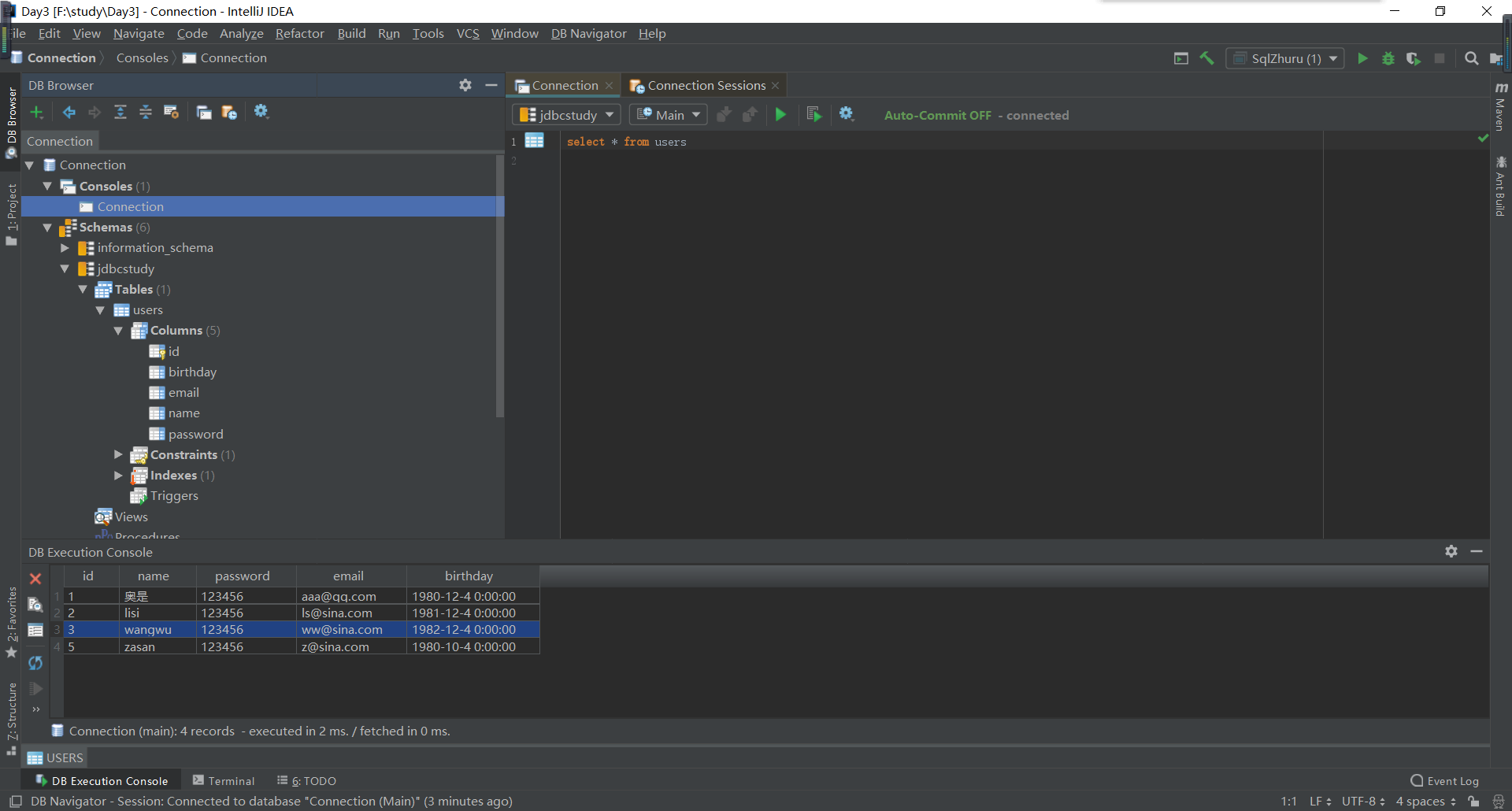 package com.jdbc.lesson03; import com.jdbc.lesson02.utils.JdbcUtils; import java.sql.*; public class TestSelect { public static void main(String[] args) { Connection co = null; PreparedStatement st = null; ResultSet rs = null; try { co = JdbcUtils.getConnection(); String sql = "select * from users where id = ?"; st = co.prepareStatement(sql);//预编译 st.setInt(1,1);//传递参数 rs = st.executeQuery();//执行 if(rs.next()){ System.out.println(rs.getString("name")); } } catch (SQLException e) { e.printStackTrace(); }finally { JdbcUtils.release(co,st,rs); } } } -