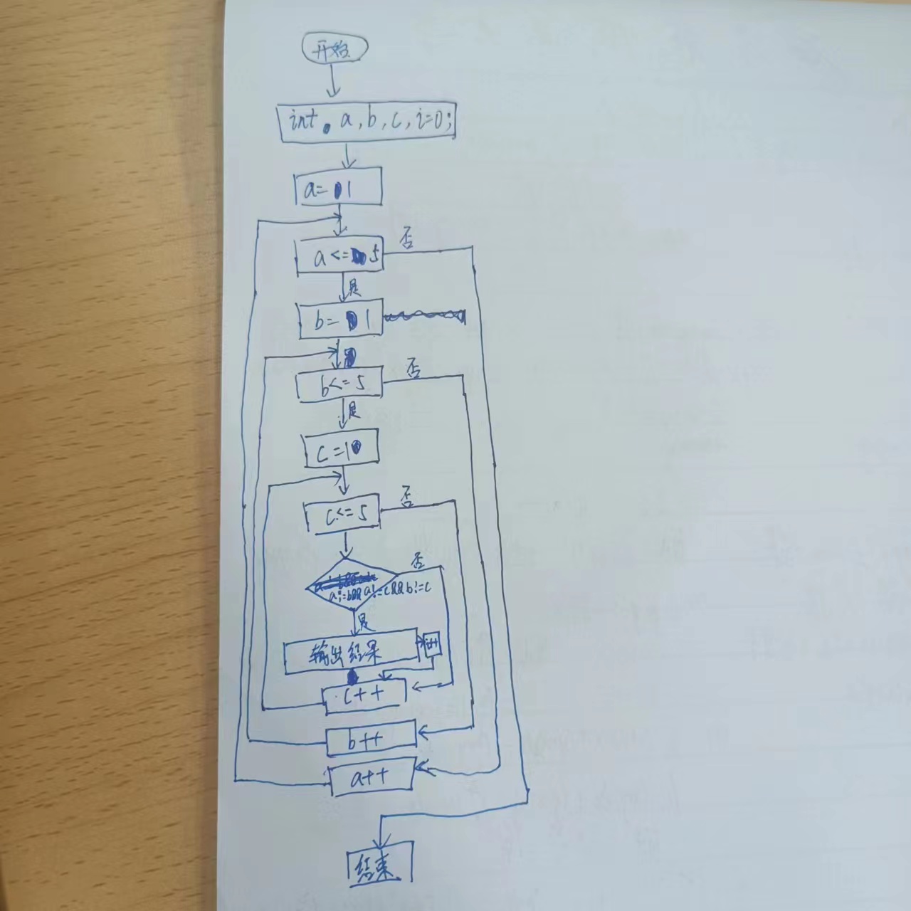 自然语言解决思路:先将A同学固定再将B同学固定,循环C同学可能拿得到的书的编号,再将A同学固定,循环B同学与C同学得书编号,最后循环三位同学的编号。由于书只能被同一学生借走,因此abc不能相等。满足此条件时进行i++,以便得到符合条件的总数。