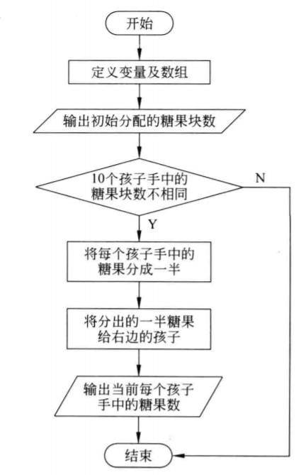自然语言解决问题:首先将每个小孩子定义,并将他们首次得到的糖果数量赋值给他们。该问题明显无法通过一次简单的传递就能结束,因此应用到循环结构。循环至所有小孩子的糖果都相同时输出次数以及所得糖果数量