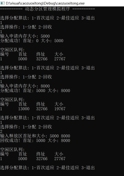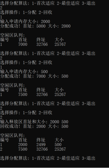 程序首先申请一整块空闲区,其首址为0,大小为32767:然后,提示用户使用哪种分配算法,再提示是分配还是回收;分配时要求输入申请区的大小,回收时要求输入释放区的首址和大小。