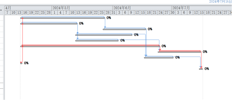 时间跨度为2024年5月至2024年7月。图表以白色为背景,蓝色水平条形图代表不同的任务或项目,每个条形图的长度对应任务的持续时间,右侧均标注“100%”,表示所有任务均按计划完成。横轴标注了具体的日期(如5月7日、10日、13日等,直至7月30日),纵轴则按任务层级从上到下排列。图中还列出了多组数字(如“13 16 19”“10 16 19”等),这些数字与条形图的位置结合,进一步明确了各任务的起止时间点。整体设计直观清晰,便于快速掌握项目进度、任务并行情况及关键时间节点。