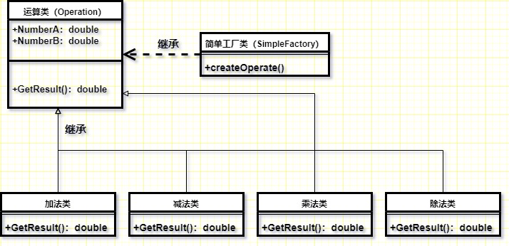 这个例子中可以把Operation类的变量和各个运算功能抽象出来,并且创建工厂类SimpleFactory和抽象运算类Operation的具体实现类。