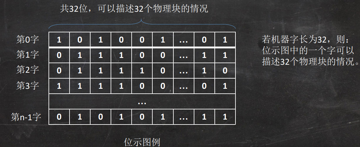 在外存上建立一张位示图(bitmap),记录文件存储器的使用情况。每一位对应文件存储器上的一个物理块,0表示空闲,1表示占用。