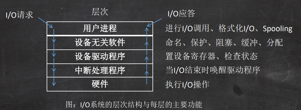 - 主要分为4层:中断处理程序、设备驱动程序、与设备无关的系统软件和用户级软件