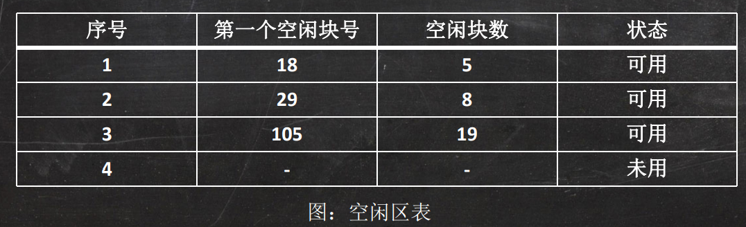 操作系统为磁盘的所有空闲区建立一张空闲表。它适用于连续文件结构。