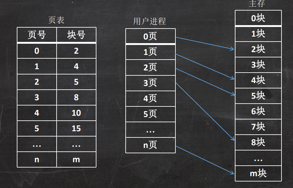 - 在为进程分配主存时,将进程中若干页分别装入多个不相邻接(离散)的块中。
