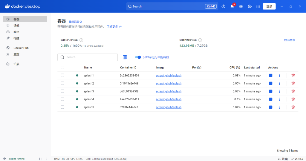 docker run -d --name splash1 -p 8050:8050 scrapinghub/splash --slots=5 --max-timeout=60 docker run -d --name splash2 -p 8051:8050 scrapinghub/splash --slots=5 --max-timeout=60 docker run -d --name splash3 -p 8052:8050 scrapinghub/splash --slots=5 --max-timeout=60 docker run -d --name splash4 -p 8053:8050 scrapinghub/splash --slots=5 --max-timeout=60 docker run -d --name splash5 -p 8054:8050 scrapinghub/splash --slots=5 --max-timeout=60 docker stats splash1 splash2 splash3 splash4 splash5 #监控状态