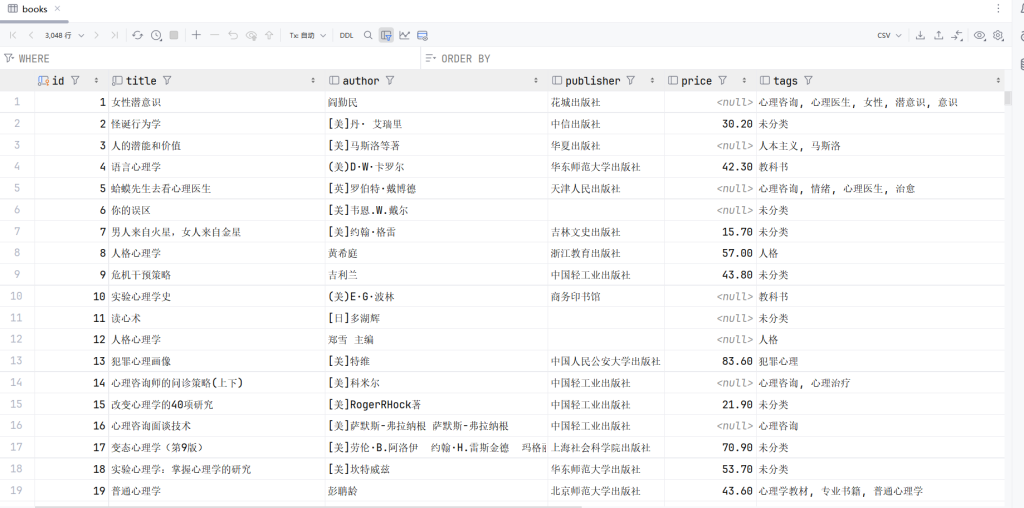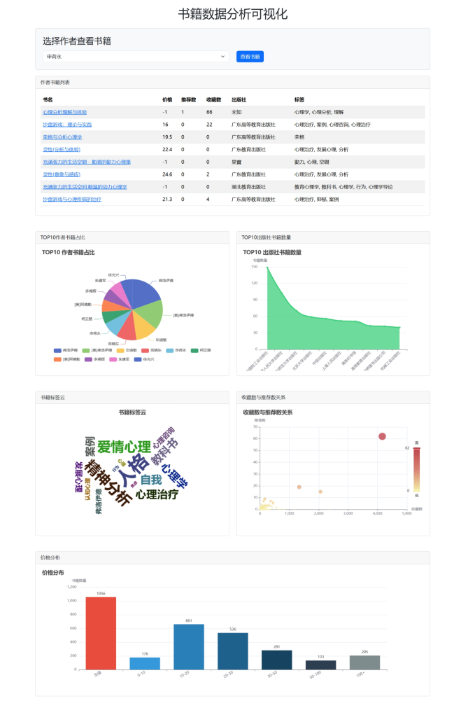 本项目聚焦于心理学专业网站 "心晴网" 的书籍数据,通过网络爬虫技术批量获取平台上的心理学书籍信息,构建包含书籍基本属性(书名、作者、出版社、简介、URL)、内容特征(标签、价格)、用户评价(收藏数、推荐数)等多维度的数据集。在数据获取基础上,运用数据清洗、文本挖掘、统计分析等技术手段,对心理学书籍的主题分布、用户偏好等进行简单剖析。最终通过交互式可视化工具,将分析结果以图表、选择器等形式直观呈现,实现对心晴网心理学书籍数据的系统化解读与应用。