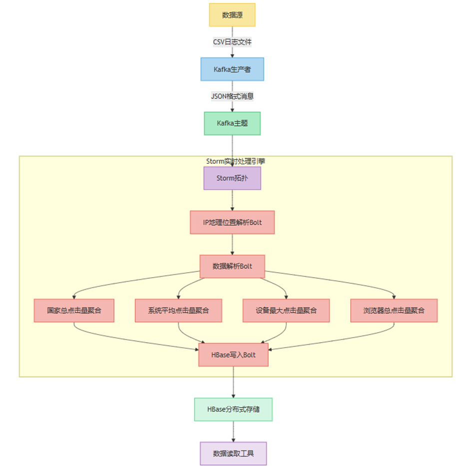 本课题的主要内容是采用 “数据采集→消息传输→实时处理→存储→查询” 的分层设计,核心组件包括 Kafka(消息队列)、Apache Storm(实时计算)、HBase(分布式存储)