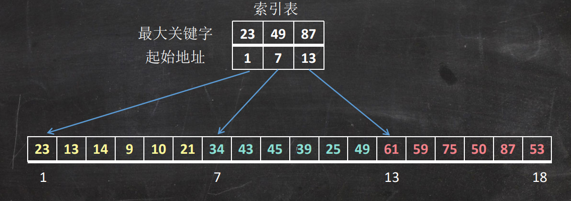 - 将表分成若干块,每一块中的关键字不一定有序,但块之间是有序的。