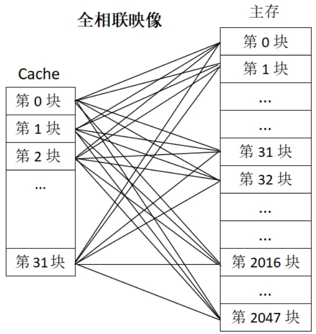 主存与Cache存储器均分成容量相同的块。允许主存的任一块可以调入Cache存储器的任何一个块的空间中。