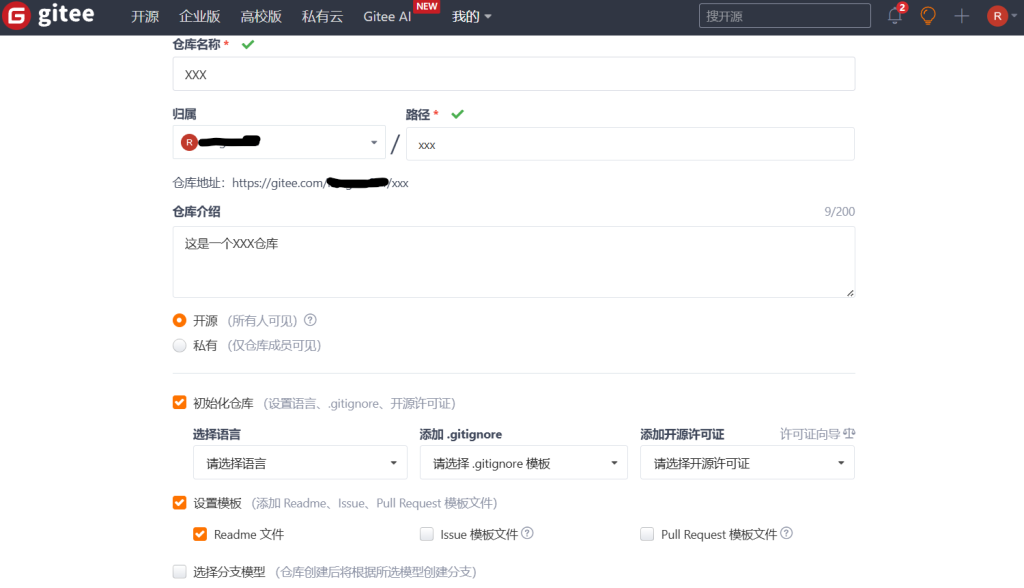 进入Gitee官网点击右上角‘+’号-新建仓库