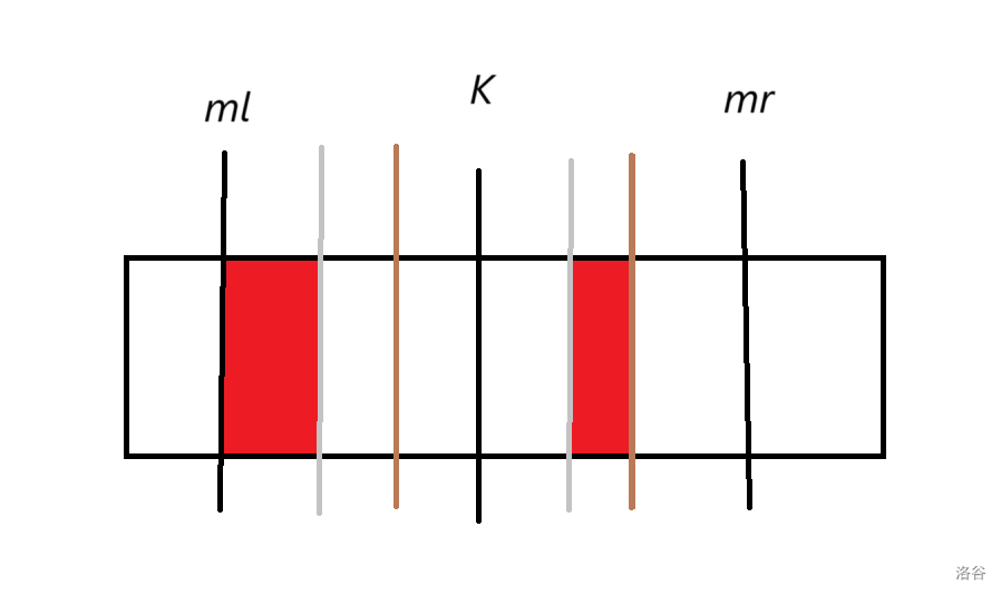 对于一个 \(k\) 可能有多个贡献区间,某些贡献会算重。考虑去重,对于 \(k\) 所支配的若干个区间 \((l_i,r_i)\),我们以 \(l_i\) 为第一关键字降序排序,\(r_i\) 为第二关键字升序排序。考虑 \((l_{i-1},r_{i-1})\) (棕线) 和 \((l_i,r_i)\) (银线),可以发现银线中去除棕线内容后就是红色部分,于是我们每次截取这个红色部分矩阵加入贡献即可。