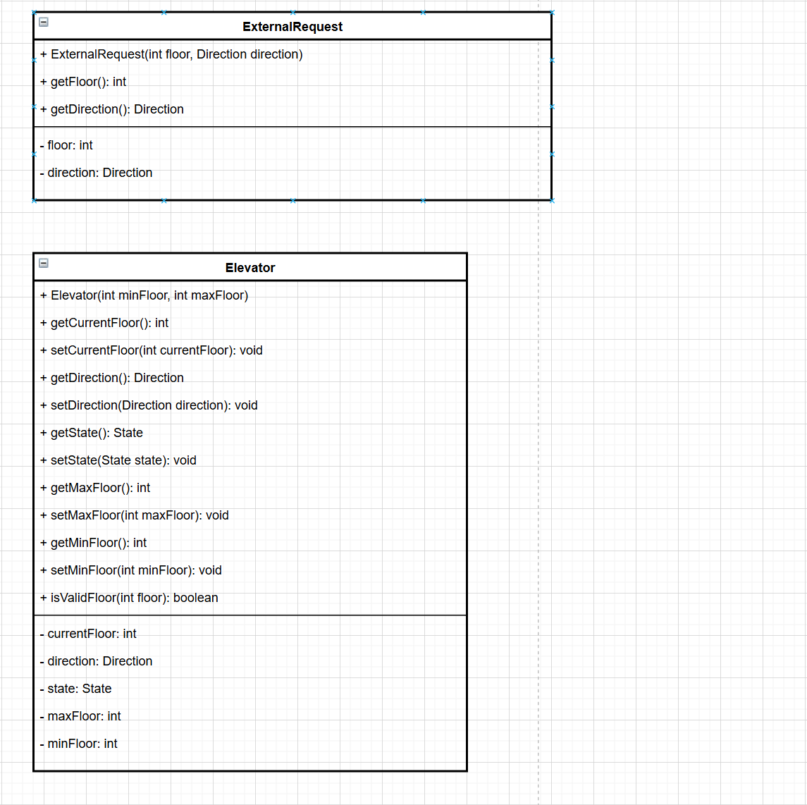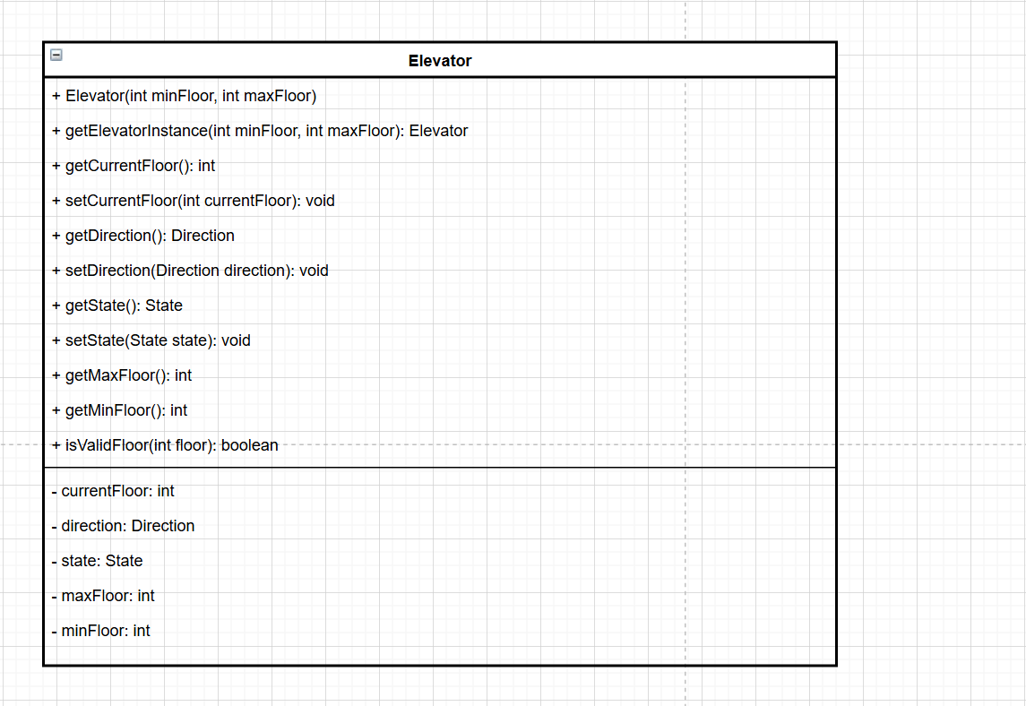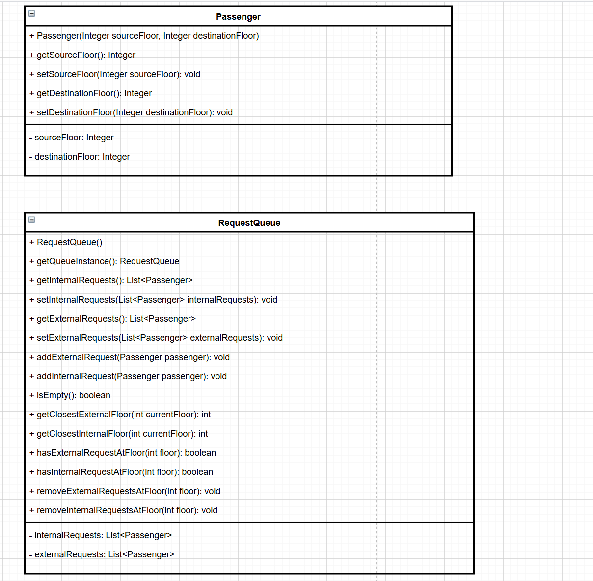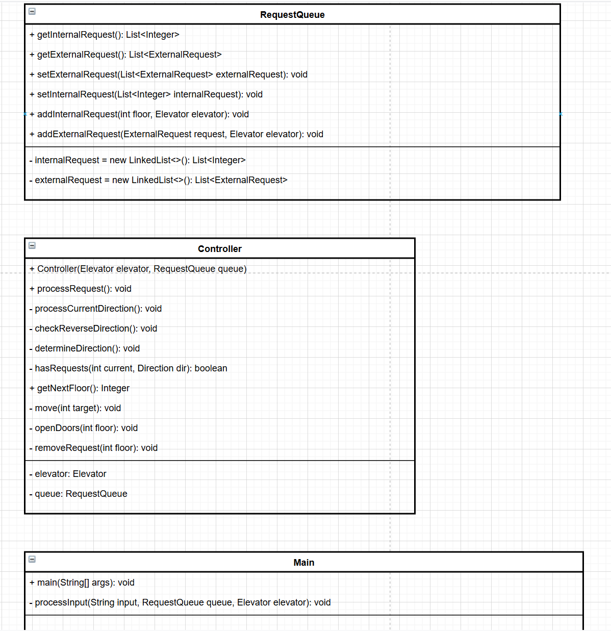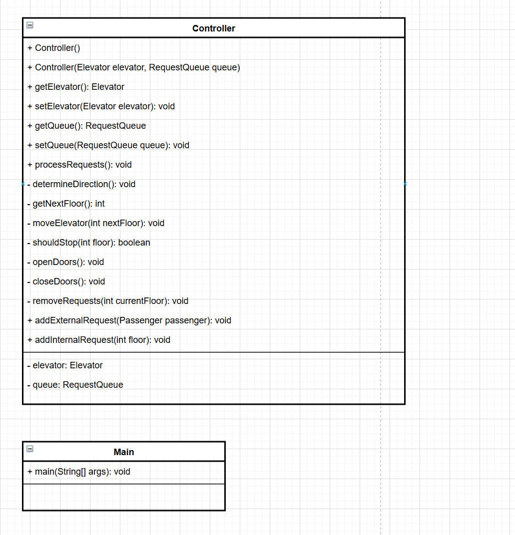 第一次迭代的代码将电梯相关功能集中在一个 Elevator 类中,包含了电梯属性定义、请求处理与运行逻辑。代码通过两个队列 interRequire 和 externalRequests 分别存储内部和外部请求,Elevator 类的构造方法初始化电梯的最小楼层、最大楼层、当前楼层和运行方向。