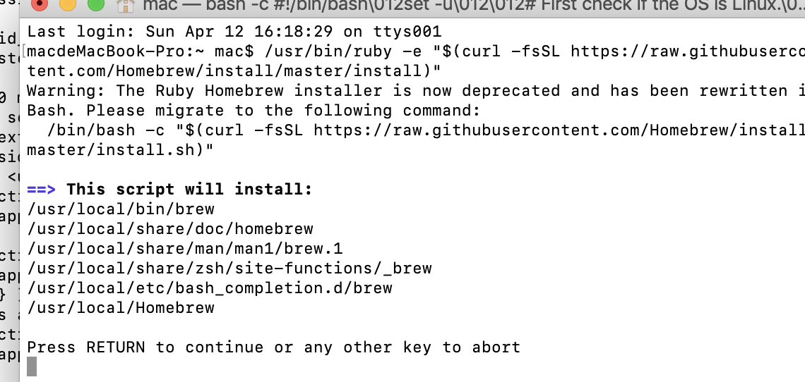 mac自带ruby环境 我们可以终端直接输入 /usr/bin/ruby -e "$(curl -fsSL https://raw.githubusercontent.com/Homebrew/install/master/install)"