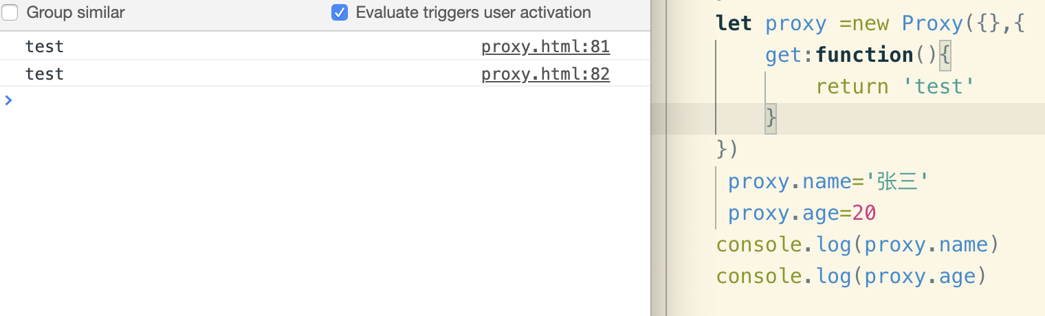 proxy顾名思义就是代理的意思,这个属性可以用来修改某些默认行为,假如我们要在访问某个对象的属性之前要做些拦截就可以用proxy来进行操作