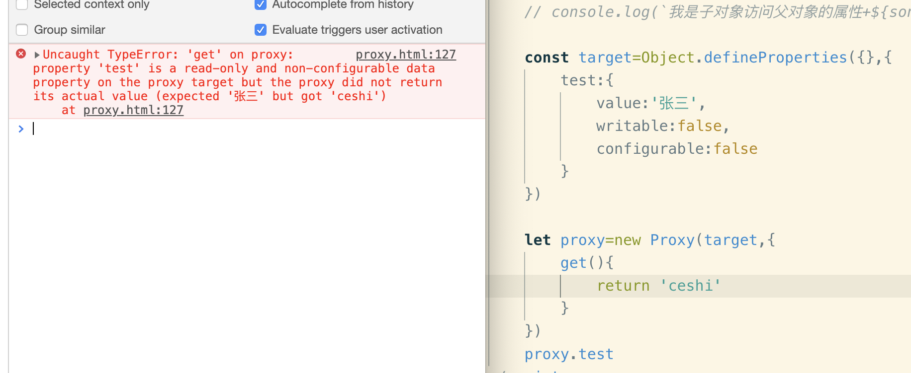 4.如果一个属性不可配置或不可写 则代理时会报错