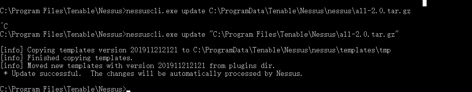在C:\Program Files\Tenable\Nessus(默认安装目录)目录下打开cmd,执行nessuscli.exe update all-2.0-tar.gz