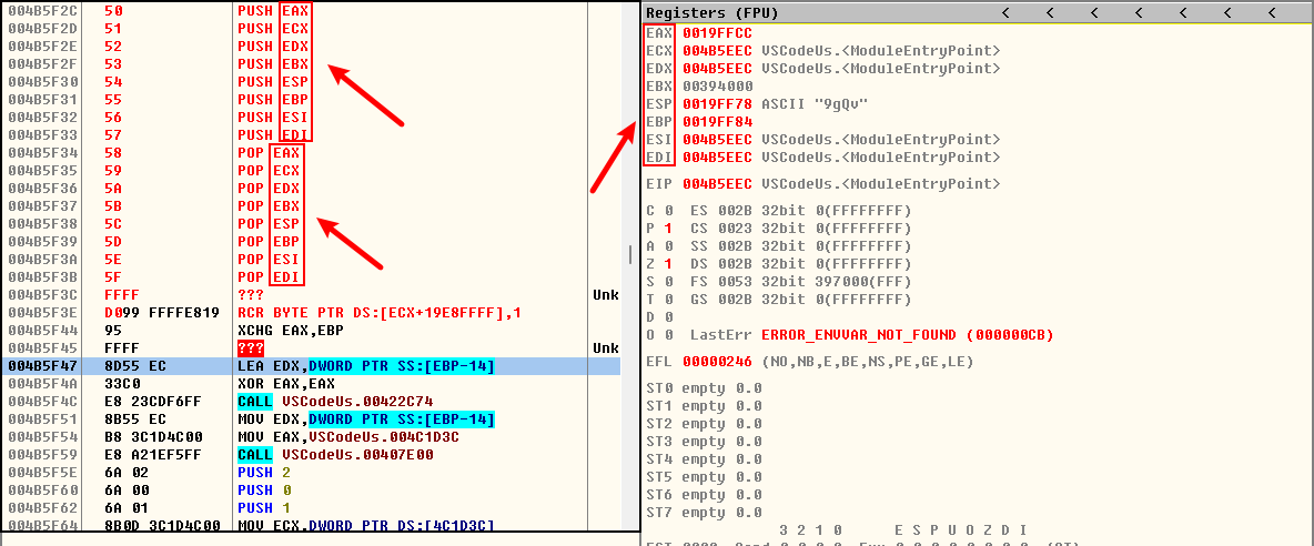 0x58 PUSH EAX 0x59 PUSH ECX 0x5A PUSH EDX 0x5B PUSH EBX 0x5C PUSH ESP 0x5D PUSH EBP 0x5E PUSH ESI 0x5F PUSH EDI