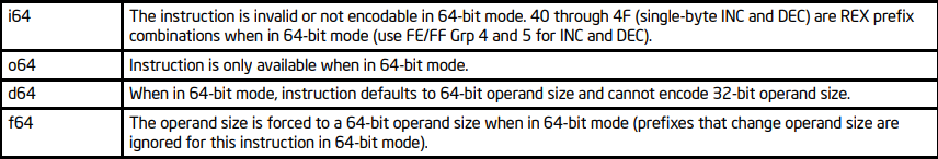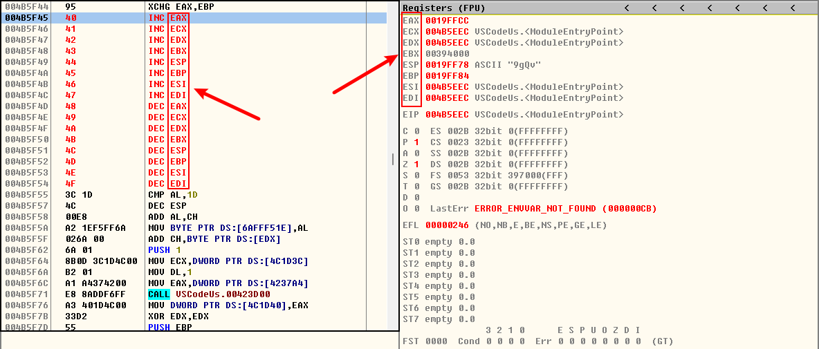 0x40 INC EAX 0x41 INC ECX 0x42 INC EDX 0x43 INC EBX 0x44 INC ESP 0x45 INC EBP 0x46 INC ESI 0x47 INC EDI
