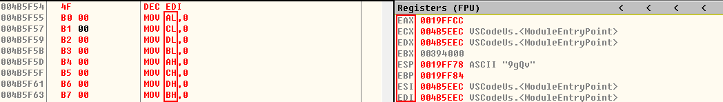 B0 00 MOV AL,0 B1 00 MOV CL,0 B2 00 MOV DL,0 B3 00 MOV BL,0 B4 00 MOV AH,0 B5 00 MOV CH,0 B6 00 MOV DH,0 B7 00 MOV BH,0
