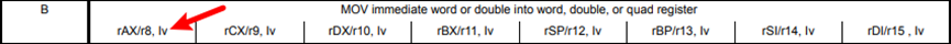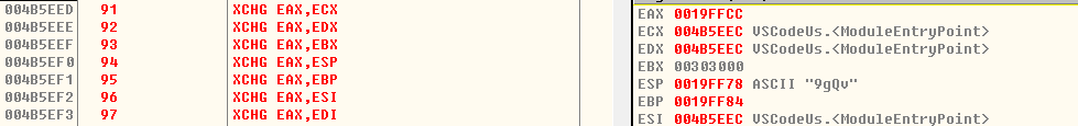 91 XCHG EAX,ECX 92 XCHG EAX,EDX 93 XCHG EAX,EBX 94 XCHG EAX,ESP 95 XCHG EAX,EBP 96 XCHG EAX,ESI 97 XCHG EAX,EDI