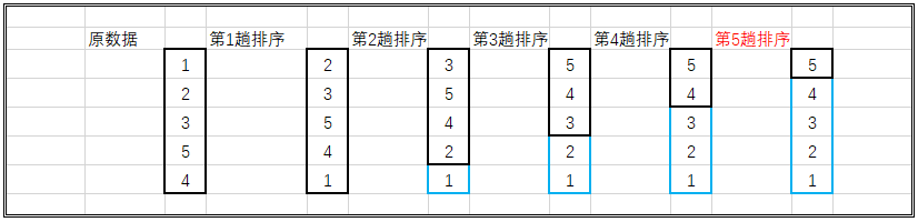 现假设数组为arrary=[1,2,3,5,4],则排序过程如下图: