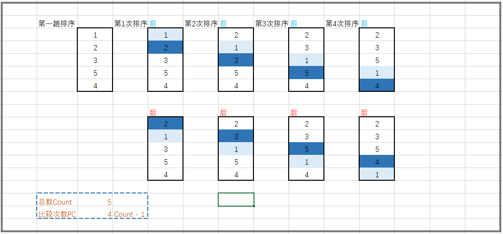 (一趟比较的每次比较,是两两进行比较所以单趟比较次数为Count-1);