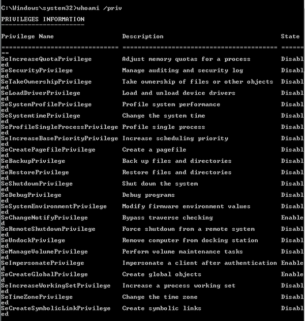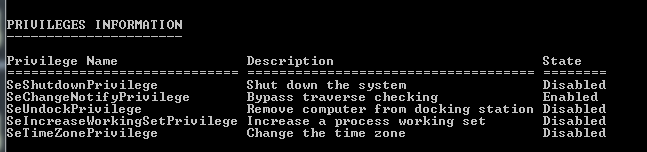 Privilege Name项表示具有的权限,State表示权限的状态,我们可以通过WinAPI AdjustTokenPrivileges将权限设置为Disabled或者Enabled