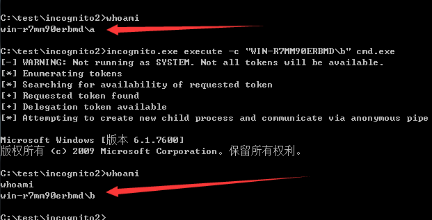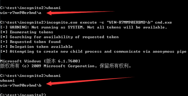 incognito.exe execute -c "WIN-R7MM90ERBMD\a" cmd.exe