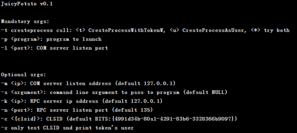 是指定COM组件的监听端口,需要选择一个未被占用的端口。- juicy-potato依赖于系统的RPC服务,默认端口号为135,如果目标机器未开放RPC服务,则可以尝试找其他开启了RPC的机器,使用参数