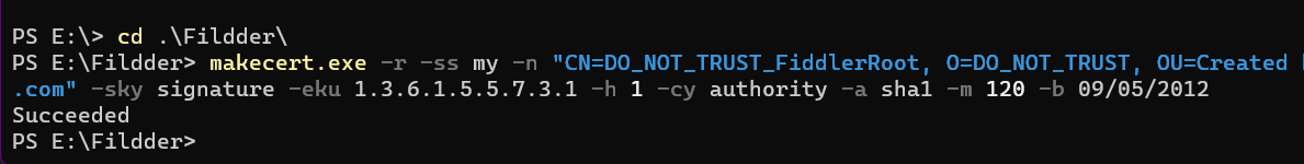 2、执行:makecert.exe -r -ss my -n "CN=DO_NOT_TRUST_FiddlerRoot, O=DO_NOT_TRUST, OU=Created by http://www.fiddler2.com" -sky signature -eku 1.3.6.1.5.5.7.3.1 -h 1 -cy authority -a sha1 -m 120 -b 09/05/2012