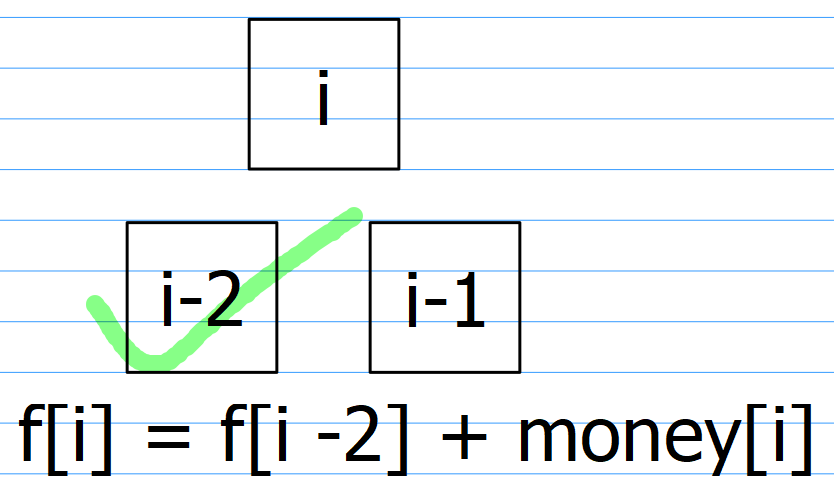 如果决定偷f[i]的话,由于不能偷窃相邻的两家,那么当前状态就必不可能从f[i - 1]转移得到,因此f[i] = f[i - 2] + monety[i]
