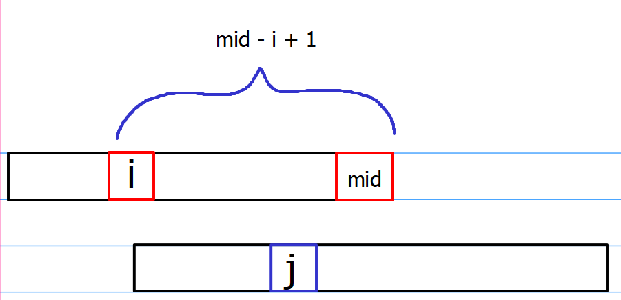当前半部分走到i,后半部分走到j时,假设num[i] > num[j],那么就意味着从i到mid的位置的所有数num[i~mid]都大于num[j],构成了一对逆序对,因此通过计算从i到mid共有mid - i + 1个数,即可知道当前状态下的逆序对。