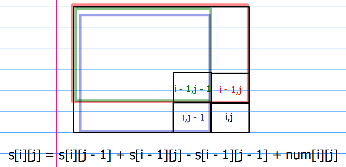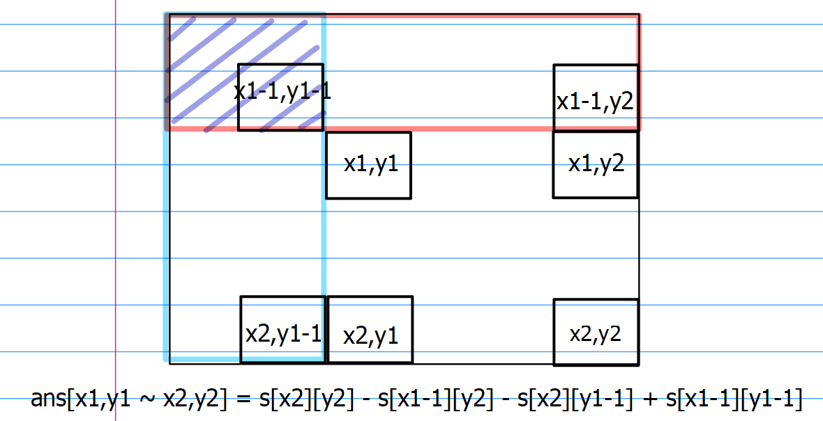 1 #include <iostream> 2 using namespace std; 3 const int N = 1009; 4 int s[N][N]; 5 int n,m,q; 6 int x1,y1,x2,y2; 7 8 int main() 9 { 10 cin >> n >> m >> q; 11 for(int i = 1;i <= n;++i) 12 for(int j = 1;j <= m;++j) 13 { 14 int num; 15 cin >> num; 16 s[i][j] = s[i - 1][j] + s[i][j - 1] - s[i - 1][j - 1] + num; 17 } 18 19 while(q--) 20 { 21 cin >> x1 >> y1 >> x2 >> y2; 22 cout << s[x2][y2] - s[x1 - 1][y2] - s[x2][y1 - 1] + s[x1 - 1][y1 - 1] << endl; 23 } 24 return 0; 25 }