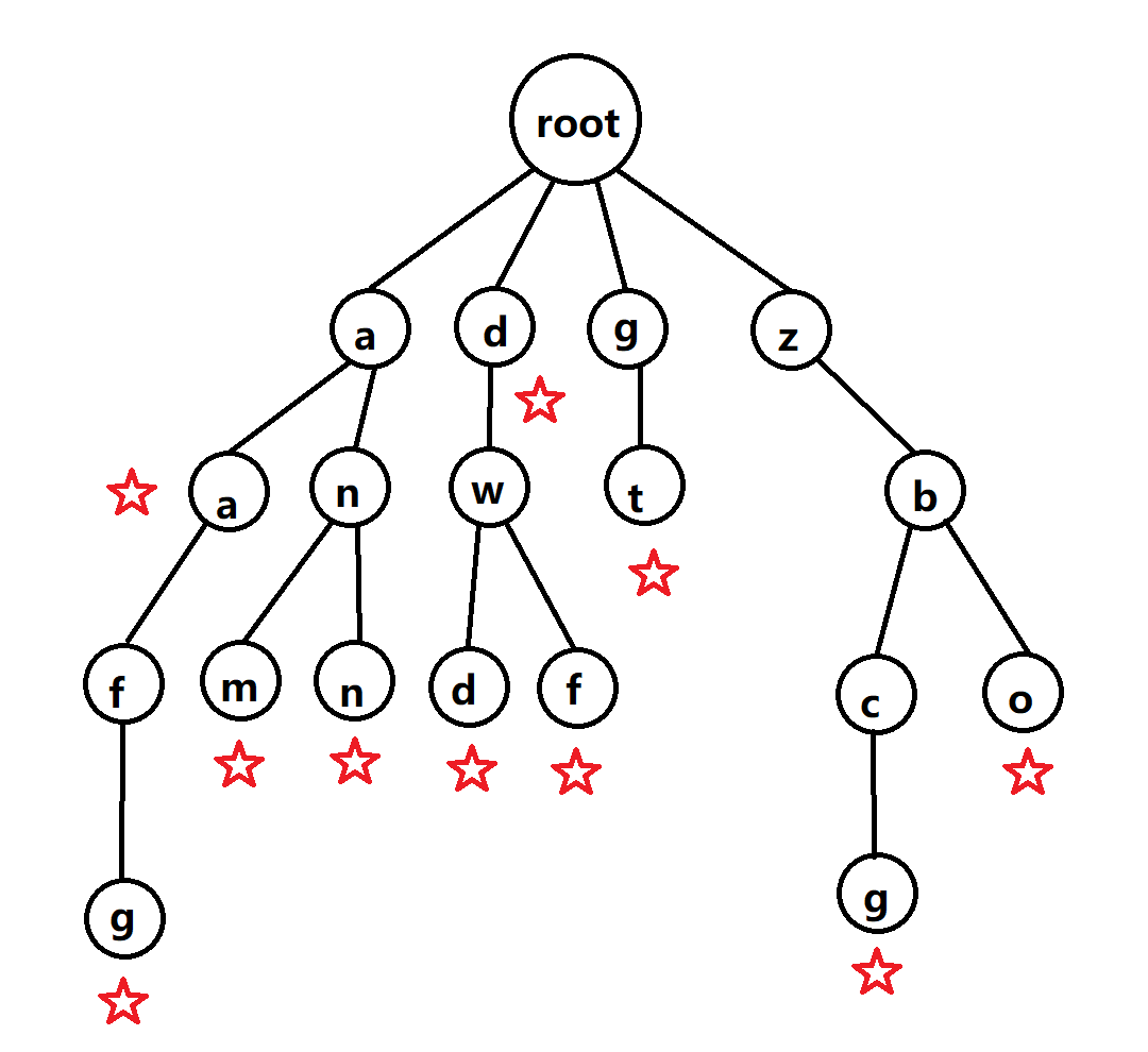 Trie 的结构非常好懂,我们用Trie[p][u]表示结点 p 的 u 字符指向的下一个结点,或着说是结点 p 代表的字符串后面添加一个字符 u 形成的字符串的结点。(u 的取值范围和字符集大小有关,不一定是 26,但本题都是小写字母,故取26)