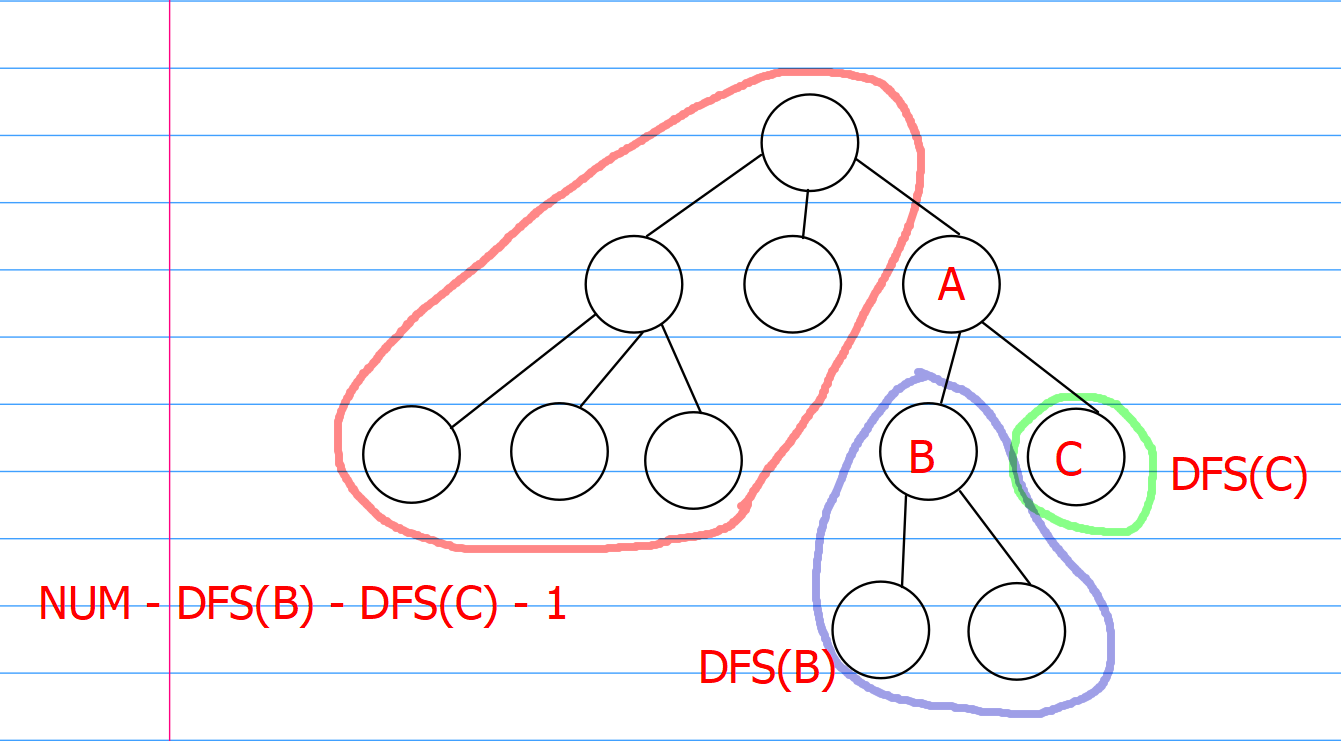 统计每个结点的连通块最大值,可以首先DFS计算结点A的每个子树结点个数,对于A的父结点连通块的节点个数,可以使用结点总数num减去结点A以及所有结点A的子树结点个数。